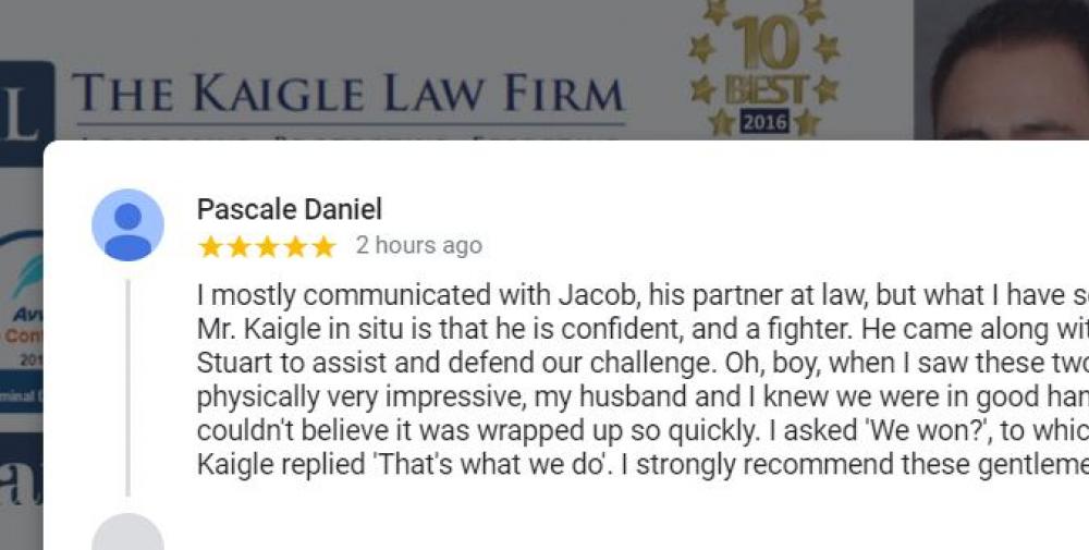 Kaigle Law specializes in an Orlando Criminal defense, and Kaigle law takes pride in their work. Many other law firms in Orlando, Florida, will not fight for you and are hoping to get an easy plea deal on your case with the State Attorney. Then they will try to talk to you into the agreement the State offers. Some plea deals are better than others, but sometimes you don't want to make a deal. Kaigle law firm will fight for you, and you can see from reviews like this one how the Kaigle law works. When they say they will fight for your rights and against the State Attorney your charges, they go hard for you.